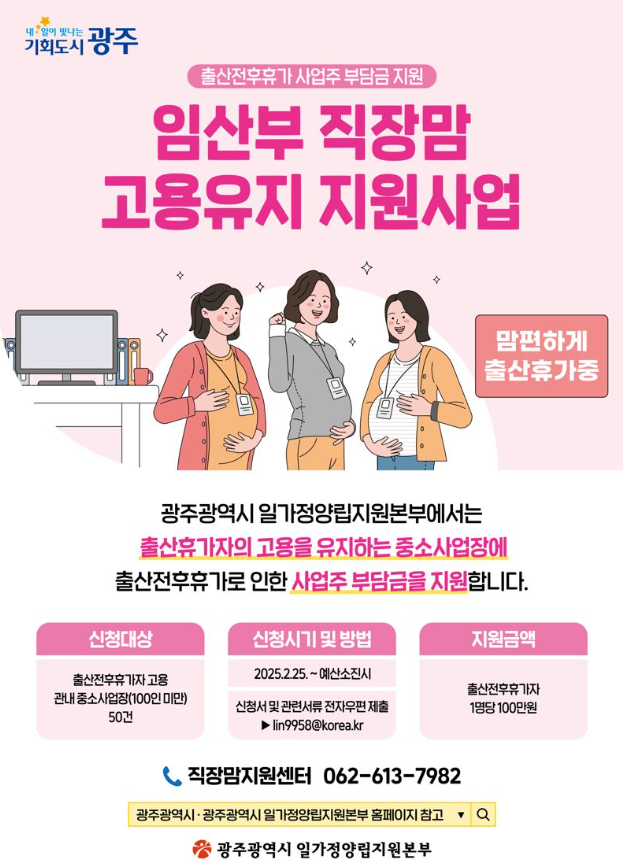 ✔ 광주광역시, 100인 미만 중소사업장 대상 ‘임산부 직장맘 고용유지 지원금’ 100만 원 지급