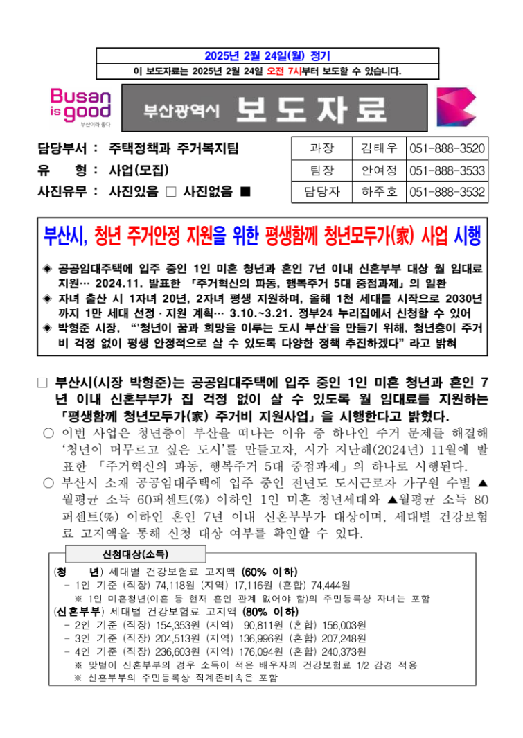 집값과 월세 부담이 커지는 요즘, 부산시가 청년과 신혼부부를 위해 월 임대료를 지원하는 ‘평생함께 청년모두가(家)’ 사업을 시작합니다. 경제적 부담을 덜고, 안정적인 주거 환경을 마련할 수 있는 절호의 기회!