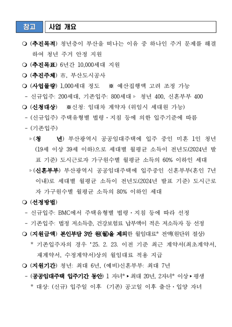 이 사업은 부산시 공공임대주택에 거주하는 청년과 신혼부부에게 월 임대료를 지원하는 정책입니다.