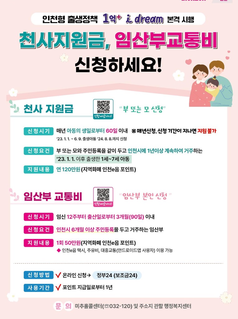 - 남편이나 부모가 대리 신청 가능 (단, 대리인 명의의 인천e음 앱 가입 필수)