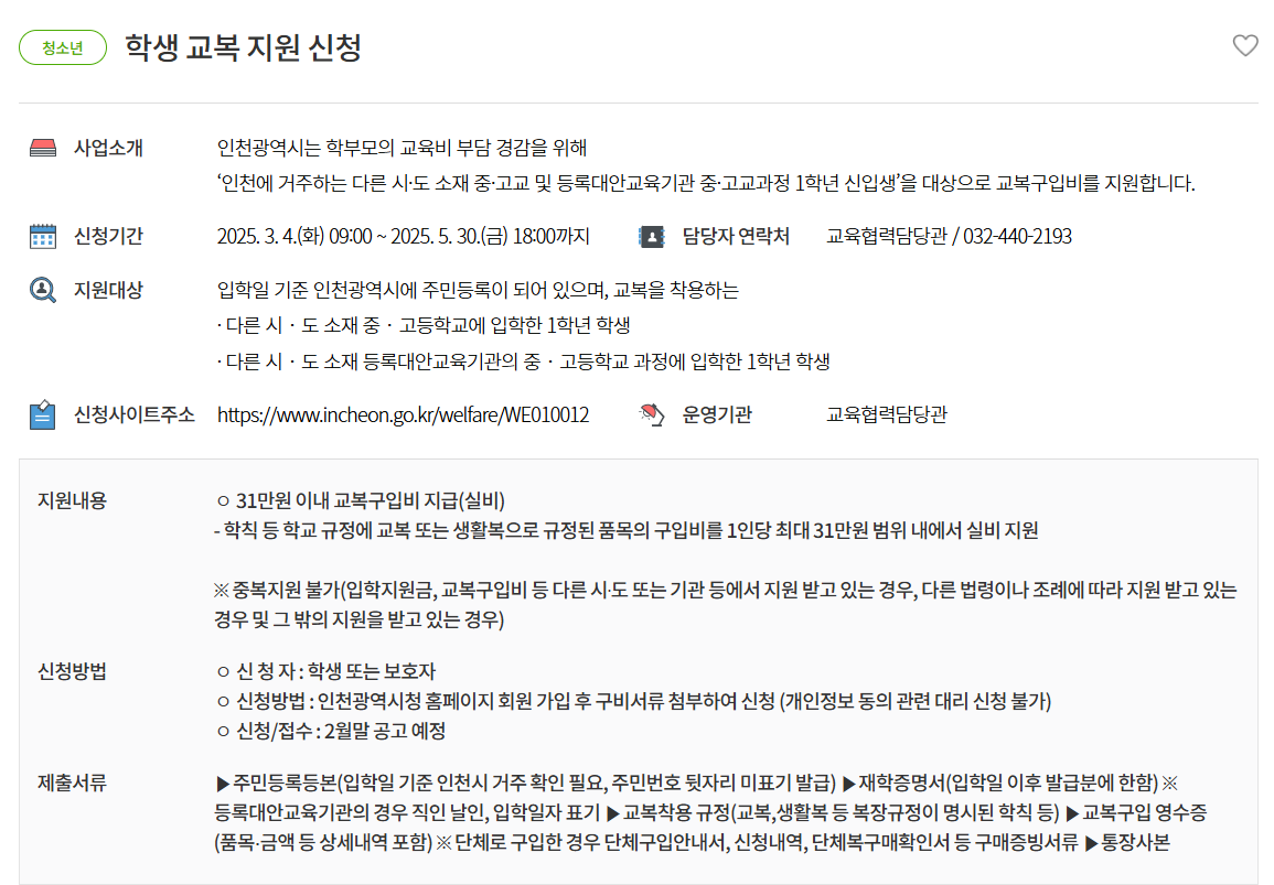 인천시 학생이면 공짜? 교복비 최대 31만 원 지원!