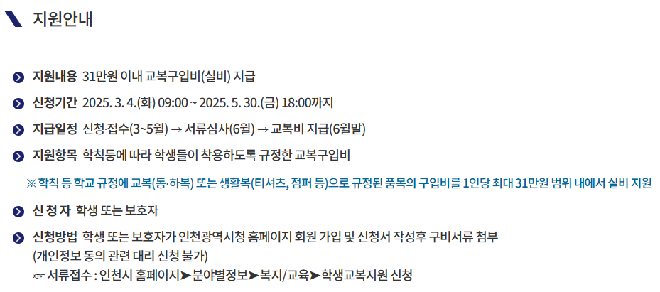 - 교복 실비 지원 (동복·하복 또는 생활복 포함)