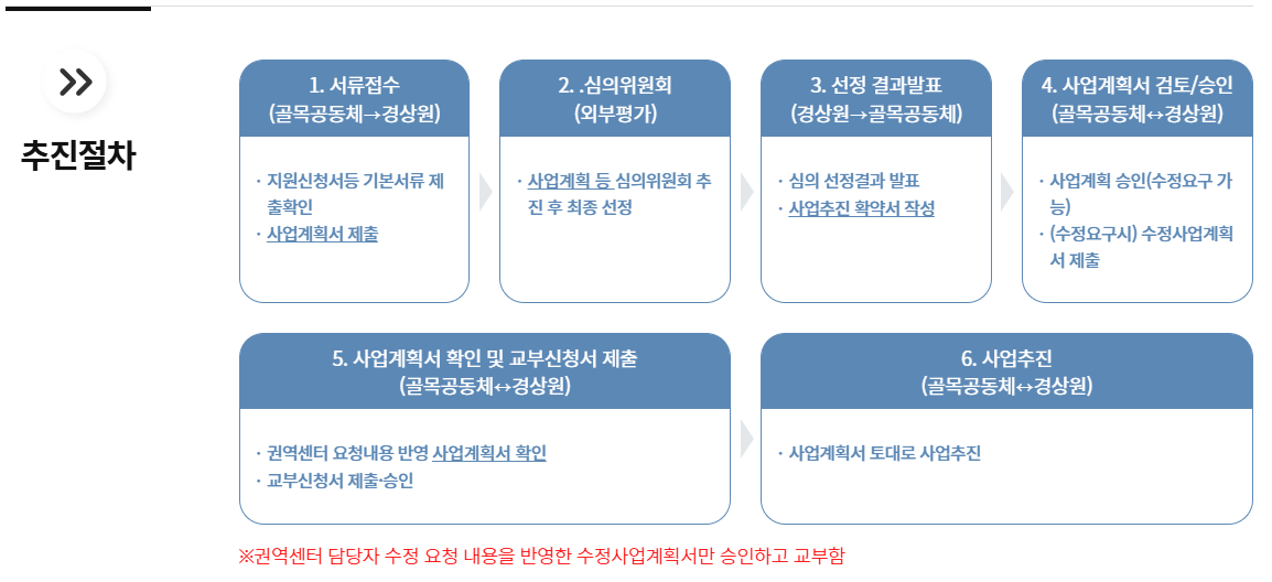 5️⃣ 사업계획서 확인 및 교부 신청서 제출 (골목공동체 ↔ 경상원)
