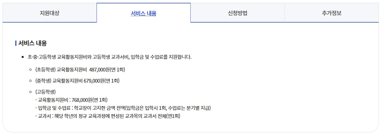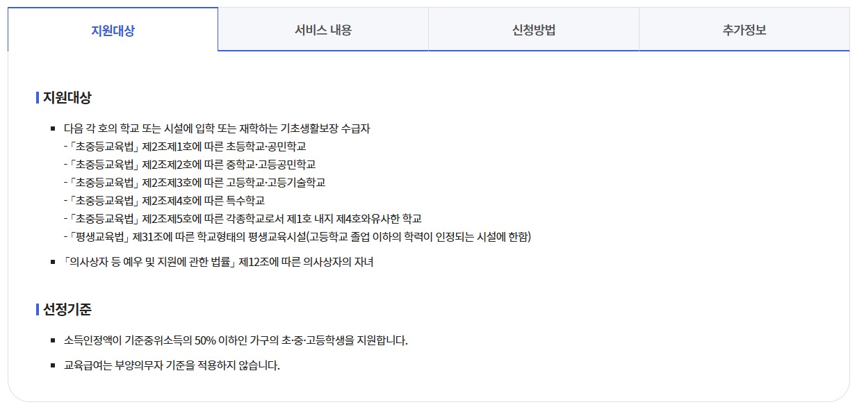 - 다만, 교육급여를 받는 경우 일부 교육비 지원 항목과 중복되지 않을 수 있습니다.