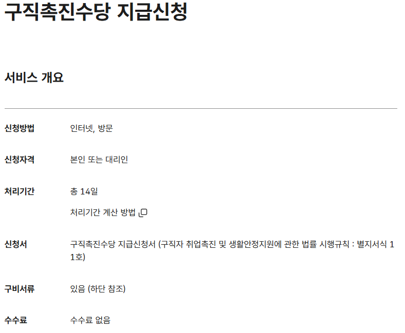 - 구직촉진수당: 취업 경험이 부족하거나, 고용보험에 가입하지 않아 실업급여를 받을 수 없는 구직자를 위한 지원금