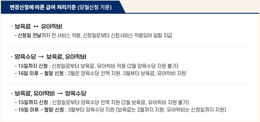 보육서비스를 변경하면 기존 급여 지급이 중단되거나 새로운 기준에 따라 조정됩니다. 변경 시 적용되는 급여 처리 기준은 다음과 같습니다.