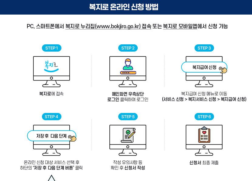 - 신청 방법 : 복지로(www.bokjiro.go.kr) 또는 읍·면·동 주민센터 방문 신청