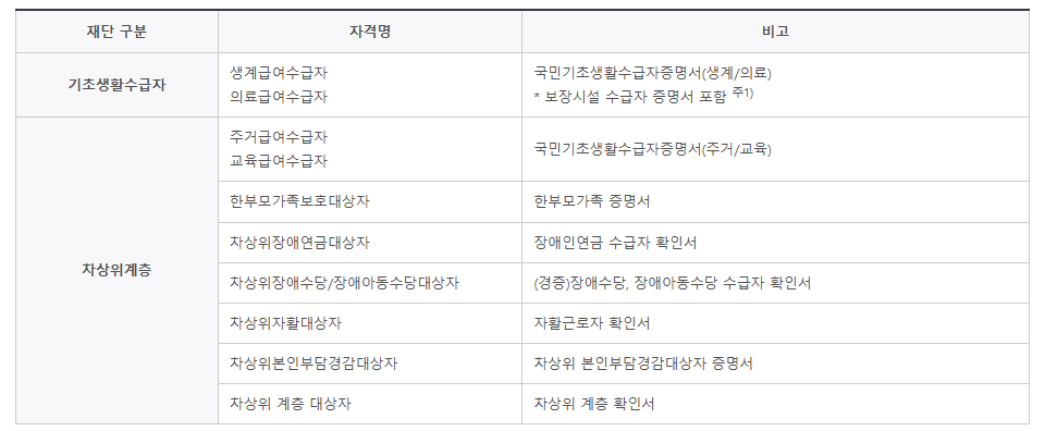 - 본인 또는 가구원(부모 등) 중 한 명이 기초생활수급자 또는 차상위계층이어야 함